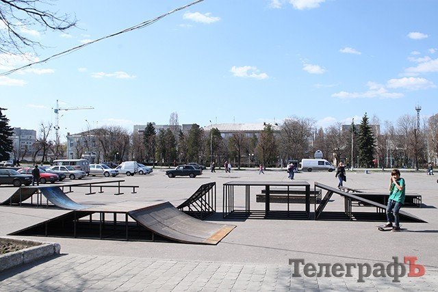 У Кременчугских скейтеров начался официальный сезон. На площади Независимости традиционно выставили оборудование для выполнения трюков на скейте. Теперь молодёжь сможет заниматься в условиях приближённым к нормальным, а не прыгать по памятникам и убегать от милиции.
