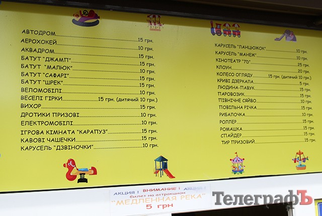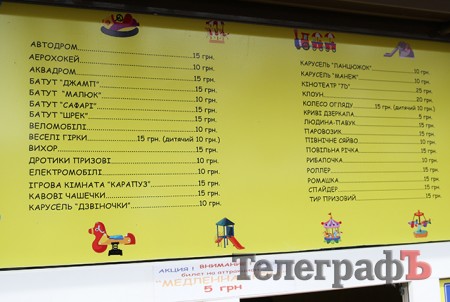 По словам кассира парка, цены не изменились. Так, «Автодром» стоит 15 грн, «Веселые горки» - взрослый билет 15 грн, детский — 10 грн. Покататься на колесе обозрения для взрослых стоит 15 грн, для детей — 10 грн. Попрыгать малыши на батуте могут за 10-15 грн.