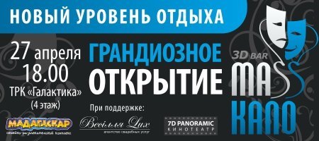 «Кременчугский Телеграф» разыграл билеты на открытие 3Д бара «Maskano» в ТРК «Галактика, которое состоится 27 апреля в 18.00.