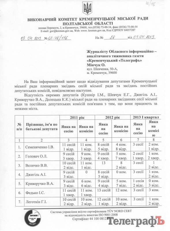 Мы получили ответ из городского совета о том, как депутаты посещали сессии и заседания постоянных депутатских комиссий за всю каденцию – это 2011-й, 2012 и 2013 год.