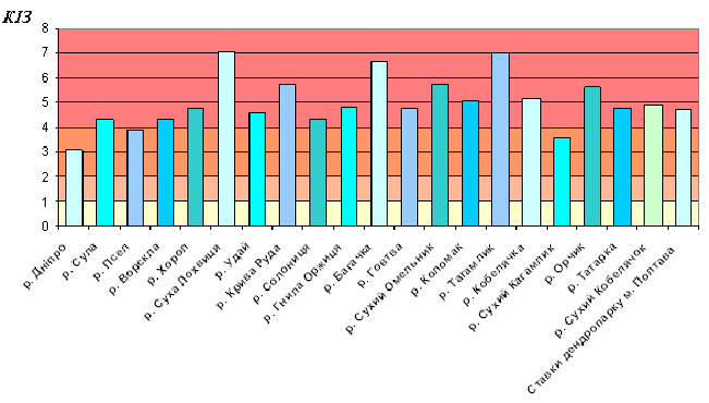 *Экологическое состояние водных объектов Полтавской области за период 2005-2011 годов оценивалось на основании комбинаторного индекса загрязнения (КИЗ) с учетом 10 показателей: хлориды; сульфаты; азот аммонийный, нитритный и нитратный; фосфор фосфатов; растворенный кислород (БПК5); железо общее; нефтепродукты.