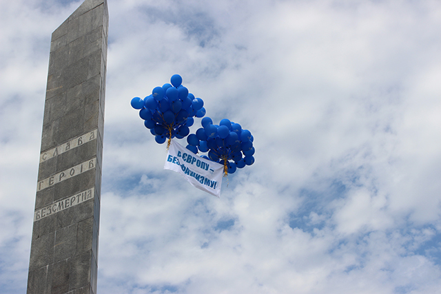 Після слів вчителя з села Розсошенці Євгена Ялівця: «Ми за мирне небо, за дружбу між народами, за утвердження людяності, загальноєвропейських цінностей» під звуки бетховенської «Оди до радості» - гімну Євросоюзу - у небо над Полтавою злетів транспарант «У Європу – без фашизму!»