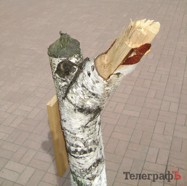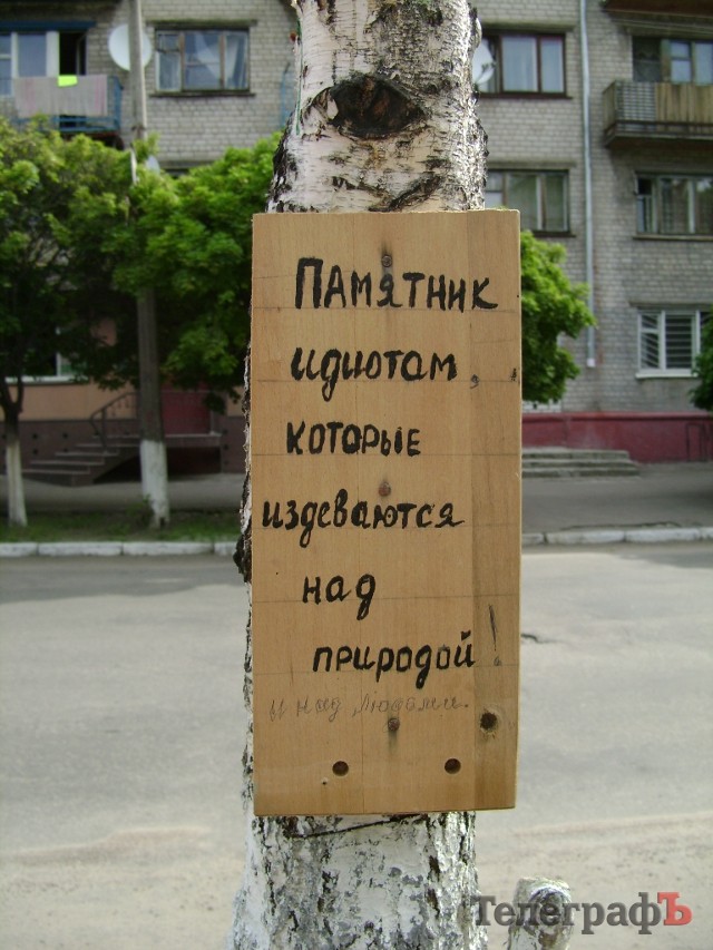 Памятник представляет собой обломанный ствол берёзы, на который неизвестный умелец прибил табличку с надписью «Памятник идиотам, которые издеваются над природой!».