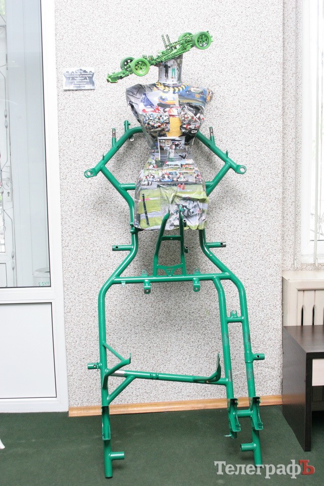 Инсталляция, посвященная спортсменам. Манекен художница разместила на каркасе картинговой машины и украсила саму скульптуру фотографиями из ралли на разных дорогах. Скульптура посвящена сыну Назару и другим спортсменам.