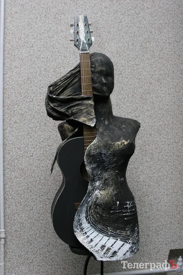 Скульптура «Женщина и музыка» - черный манекен, половину которого составляет настоящая гитара, вставленная внутрь скульптуры, а на самом «теле» этой работы нарисованы клавиши фортепиано.