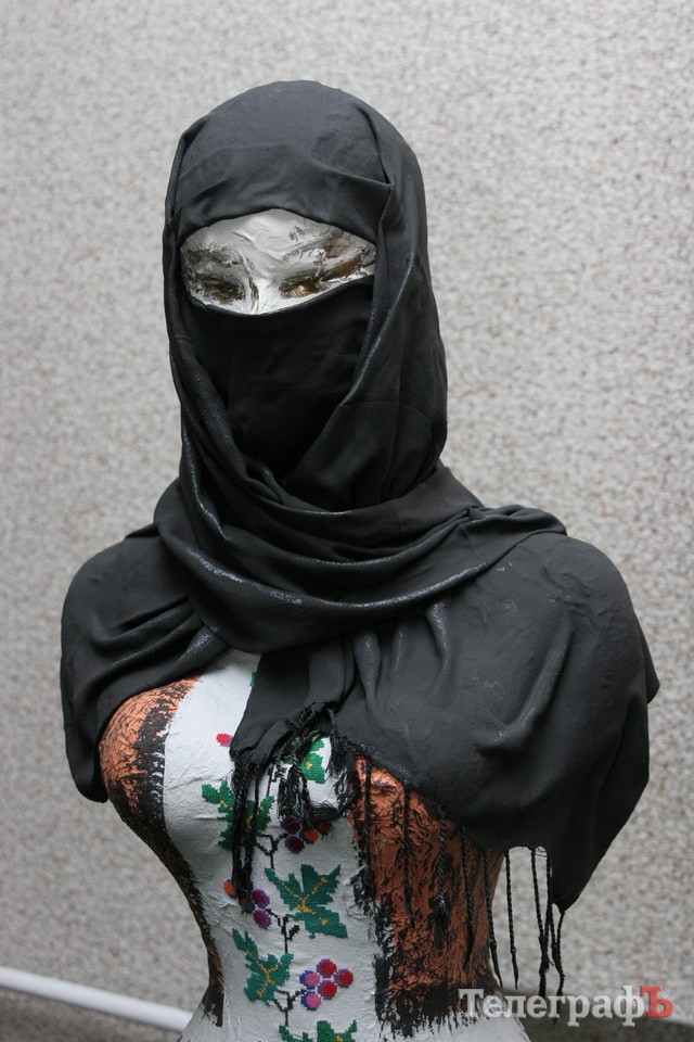 Поражает воображение скульптура «Мусульманский и христианский мир» - манекен, «голова» которого закутана в паранджу, а на «теле» словно одета вышиванка.