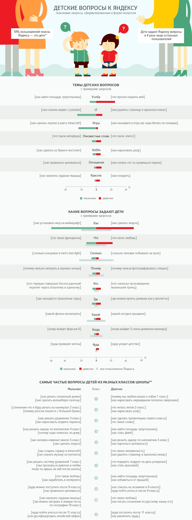 Запросы детей стремительно меняются с возрастом. Если в первом классе дети спрашивают, «как делать Спичечный домик», то в четвертом – «как найти площадь треугольника», в седьмом – «как признаться девочке в любви, когда ты идешь за ней после школы», а в одиннадцатом – «куда пойти учится после 11 класса» и «как увеличить грудь».