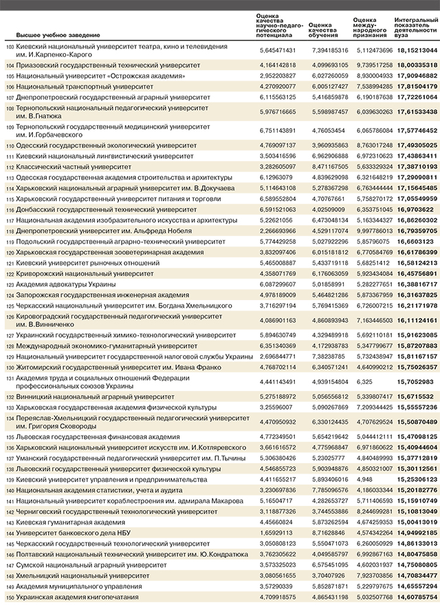 Сохранили ведущие позиции Харьковский национальный университет им. В.Каразина, Национальный университет «Киево-Могилянская академия», Национальный медицинский университет им. А.Богомольца, которые входят в пятерку лидеров.