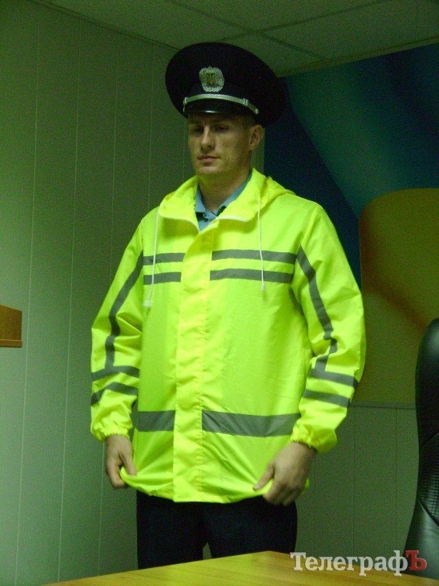 Это лёгкие курточки ярко-лимонного цвета со светоотражающими элементами. Сзади нанесена надпись «Міліція Кременчук».