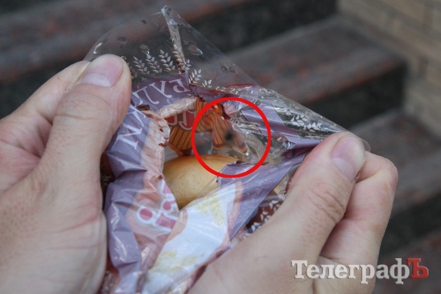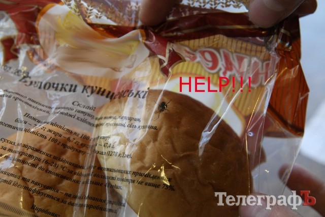 26 июля в редакцию «Телеграфа» пришёл кременчужанин Олег и принёс нам… булочки, которые купил в супермаркете. Обычные кунцевские булочки в полиэтиленовой упаковке. Вместе с ними в запаянном пакете находилась… живая муха! Обычная домашняя муха, которая маневрировала внутри пакета между булок и тщетно пыталась найти выход. Судя по дате на упаковке «26.07.2013», насекомое томилось в неволе только первые сутки.