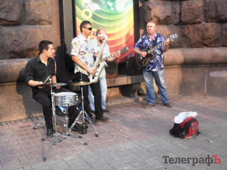 На Хрещатику та на інших вулицях та провулочках Києва попри зіркові виступи на великій сцені місцеві артисти – вуличні музиканти - теж давали свій концерт. Такий собі джаз-гурт обступило своє коло прихильників.