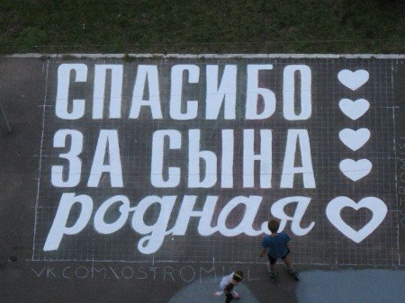 28 июля в Кременчуге, в 304 квартале, на асфальте во дворах появилась надпись «Спасибо за сына, родная!» Так кременчужанин Вилен отблагодарил жену за рождение ребёнка. Причём на асфальте рисовал не он сам, а художник Сергей Брилёв.