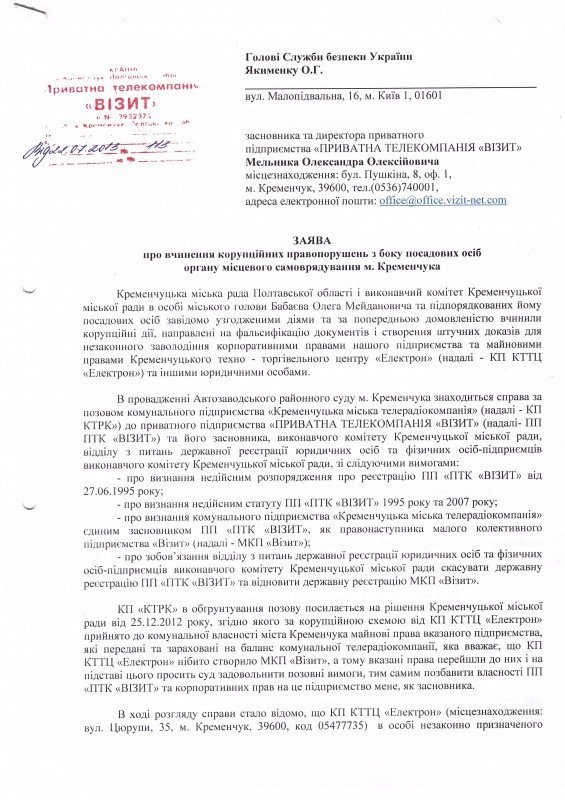 Это обращение – ответ на заявление собственника ЧТК «Визит» Александра Мельника, которое распространили СМИ 29 июля. Александр Мельник обвинил в коррупционных действиях мэра Кременчуга Олега Бабаева, директора коммунального предприятия «Рыночная площадь» Александра Гаврилова и директора коммунальной телерадиокомпании Сергея Перепелятника.