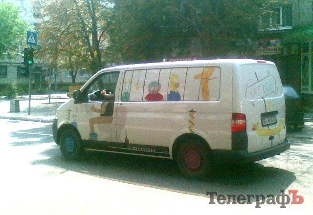 В Кременчуге замечен мультяшный позитивомобиль – на борту Volkswagen Transporter нарисованы герои мультфильмов South Park, «КотПёс», «Симпсоны». На водительской двери изображён мужчина, сидящий на унитазе. Видимо, таким образом, водитель хочет показать как страшно ему ездить по нашим дорогам.
