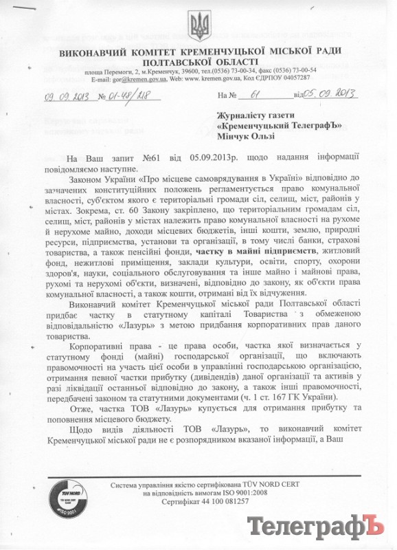 «ТелеграфЪ» получил ответ на повторный запрос, с какой целью исполком Кременчугского горсовета приобретет долю в уставном капитале ООО «Лазурь». Решение купить часть этого предприятия исполком утвердил 3 сентября.