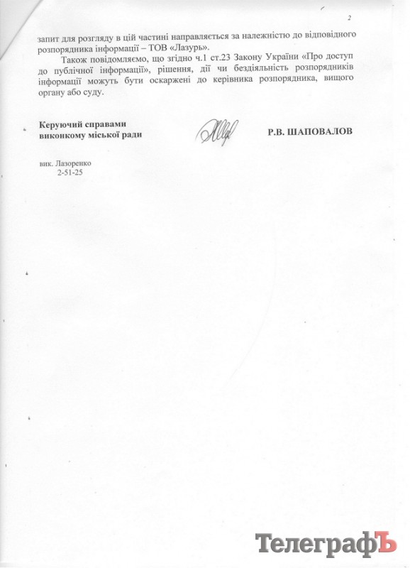 Напомним, «ТелеграфЪ» обращался с запросом к начальнику юридического отдела мэрии Юрию Браташу, который предложил исполкому приобрести часть капитала «Лазури», какая цель приобретения, чем занимается «Лазурь» и зачем это кременчужанам. Однако господин Браташ на наши вопросы не ответил, мотивируя это тем, что юротдел «не является распорядителем информации». Тогда мы перенаправили запрос на мэра Кременчуга Олега Бабаева.