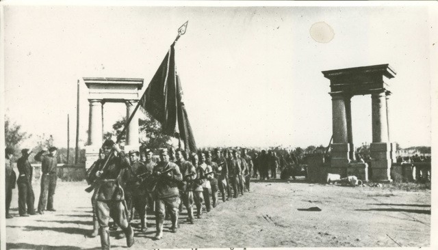 – 29 сентября 1943 года в сражении за село Песчаное взвод охраны знамени смело вступил в бой с немецкими поджигателями, которые пытались сжечь село, – рассказывает Вячеслав Ивушкин. – Часть факельщиков перебили, остальные спасались бегством. В результате смелых и решительных действий наших бойцов село Песчаное не было сожжено гитлеровцами. А гвардейцев, которые отличились в этом бою, от имени Президиума Верховного Совета СССР командир 17-го Гвардейского воздушно-десантного полка наградил медалями «За отвагу». Это рядовые Карфидов Степан Никандрович, Моржанцев Николай Михайлович, Рузинов Давид Абрамович. Еще двое отличились в бою за Днепр. 4 октября 1943 года при форсировании Днепра 17-м Гвардейским воздушно-десантным полком в районе Самусеевки взвод охраны полкового знамени попал под сильный минометно-артиллерийский обстрел с правого берега реки. Спасая полковое знамя, рядовые Никита Константинович Кобылкин и Иван Петрович Кондрашов прикрыли его своим телом. Есть наградной лист и на старшину Никиту Семеновича Бабусенко. Ему тоже вручили медаль «За отвагу». Это их, бойцов взвода охраны полкового знамени, идущих строевым шагом вслед за знаменосцем по центральной улице нашего города, запечатлел фотограф.