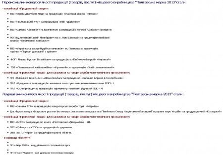 В Полтаве подвели итоги конкурса качества продукции «Полтавская торговая марка-2013», которую организовывала Полтавская тогово-промышленная палата. Как сообщила начальник управления торговли мэрии Людмила Жорняк, два кременчугских предприятия заняли призовые места в двух номинациях.