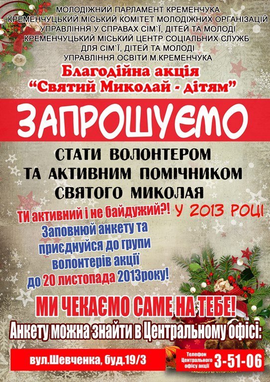 Кременчугский городской комитет молодежных организаций и Молодежный Парламент Кременчуга совместно с управлением по делам семьи, детей и молодежи, управлением образования уже одиннадцатый год подряд проводят общегородскую благотворительную акцию «Святой Николай – детям».