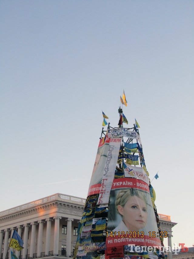 На каркасе несостоявшейся Йолки, украшенном революционной символикой, кременчугский плакат размещен на самом верху.