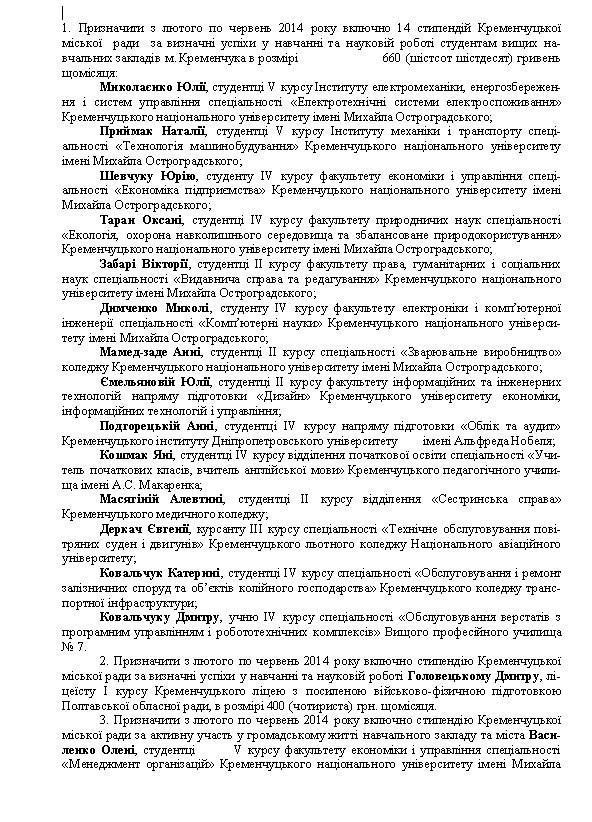 В частности, за выдающиеся успехи в учебе и научной работе 14 студентов из вузов Кременчуга в течение пяти месяцев, с февраля по июнь 2014 года будут получать специальную стипендию в размере 660 гривен.