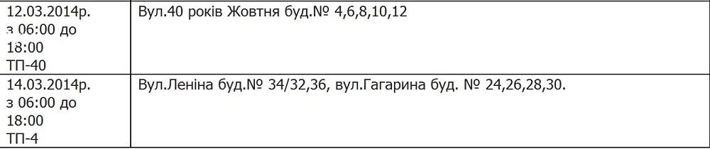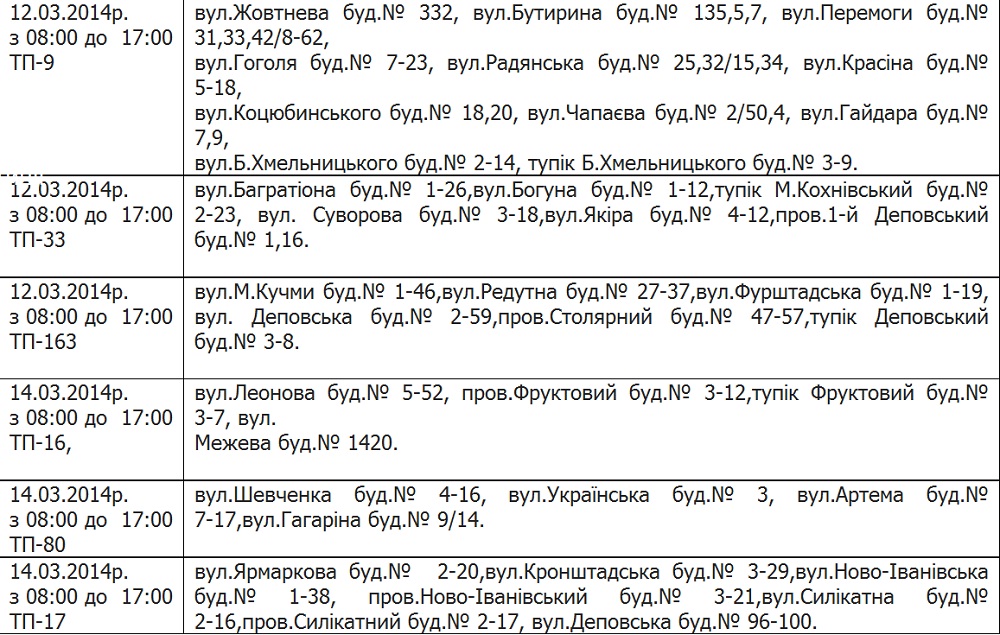 В Кременчуге 12 и 14 марта будут отключены от электричества некоторые дома и учреждения (адреса в таблице) в связи с ремонтными работами энергетиков. Об этом сообщает пресс-служба мэрии со ссылкой на "Полтаваоблэнерго".