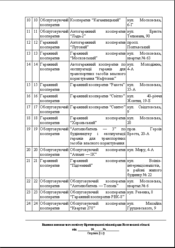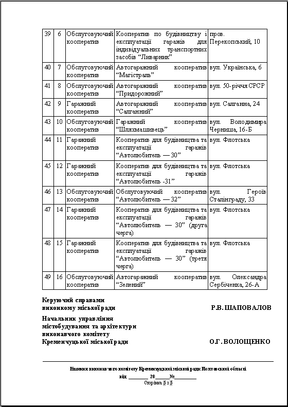 Во исполнение Положения о порядке хранения транспорта граждан и юридических лиц на территории Кременчуга, утвержденного городским советом 26 июня 2013 года, исполком утвердил перечень существующих гаражных кооперативов, которые обязаны привести документацию в соответствие с законодательством.
