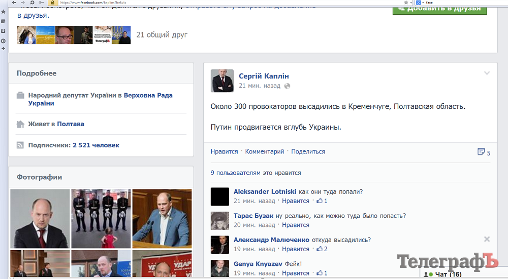 Народный депутат Сергей Каплин напугал кременчужан информацией о трёх сотнях провокаторов, которые «высадились» в Кременчуге. Такое сообщение нардеп разместил 15 апреля около 14.30 у себя на странице в социальной сети Facebook.