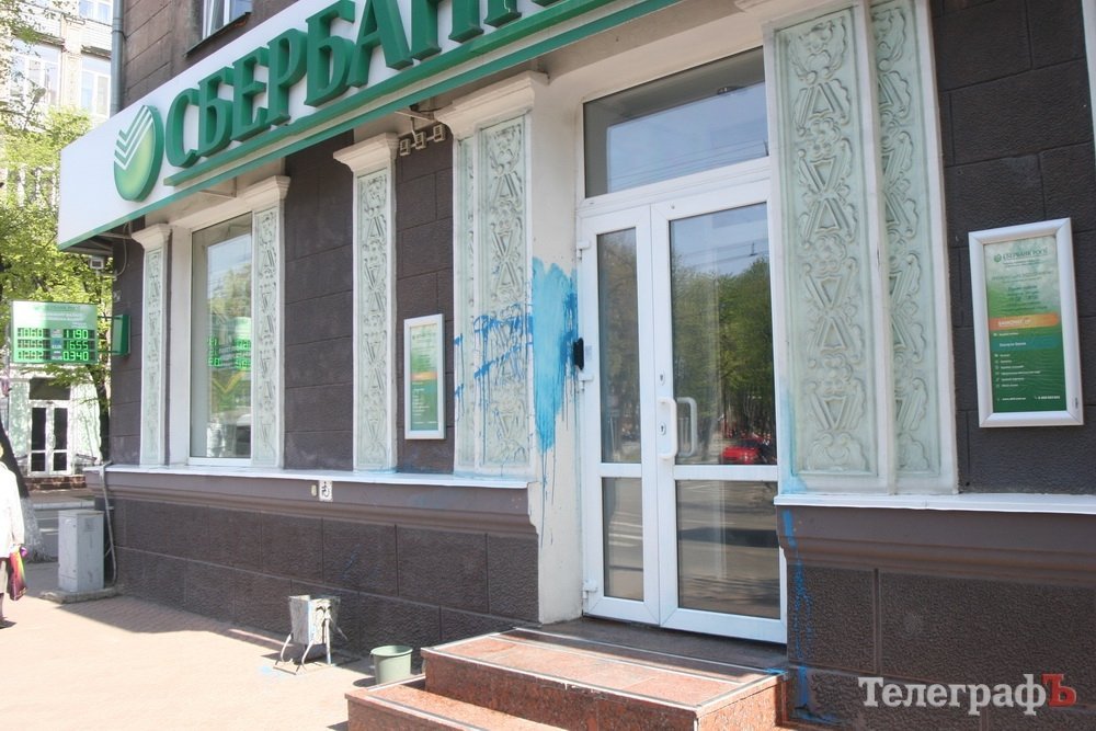 В Кременчуге отделение «Сбербанка России» на углу ул. Ленина и Пролетарской неизвестные облили синей краской. Залили окна, дверь, ступеньки. Технические работники смыли краску со стеклянных и пластиковых поверхностей, но на штукатурке и граните она осталась. «Телеграф» прошёлся по «синему» следу – он ведёт от банка во двор дома 26/37. За трансформаторной будкой мы обнаружили бутылку с остатками свежей синей краски.