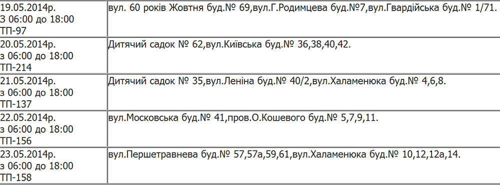 В Кременчуге с 19 по 23 мая 2014г. в связи с проведением текущих и капитальных ремонтов трансформаторных подстанций и воздушных электросетей, направленных на улучшение качества электроснабжения, будут временные перерывы в электроснабжении потребителей, проживающих в районе следующих улиц:
