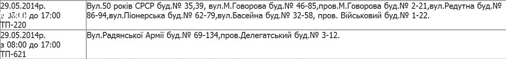 В частности завтра, 29 мая, запланированы отключения света в районе следующих улиц Кременчуга: