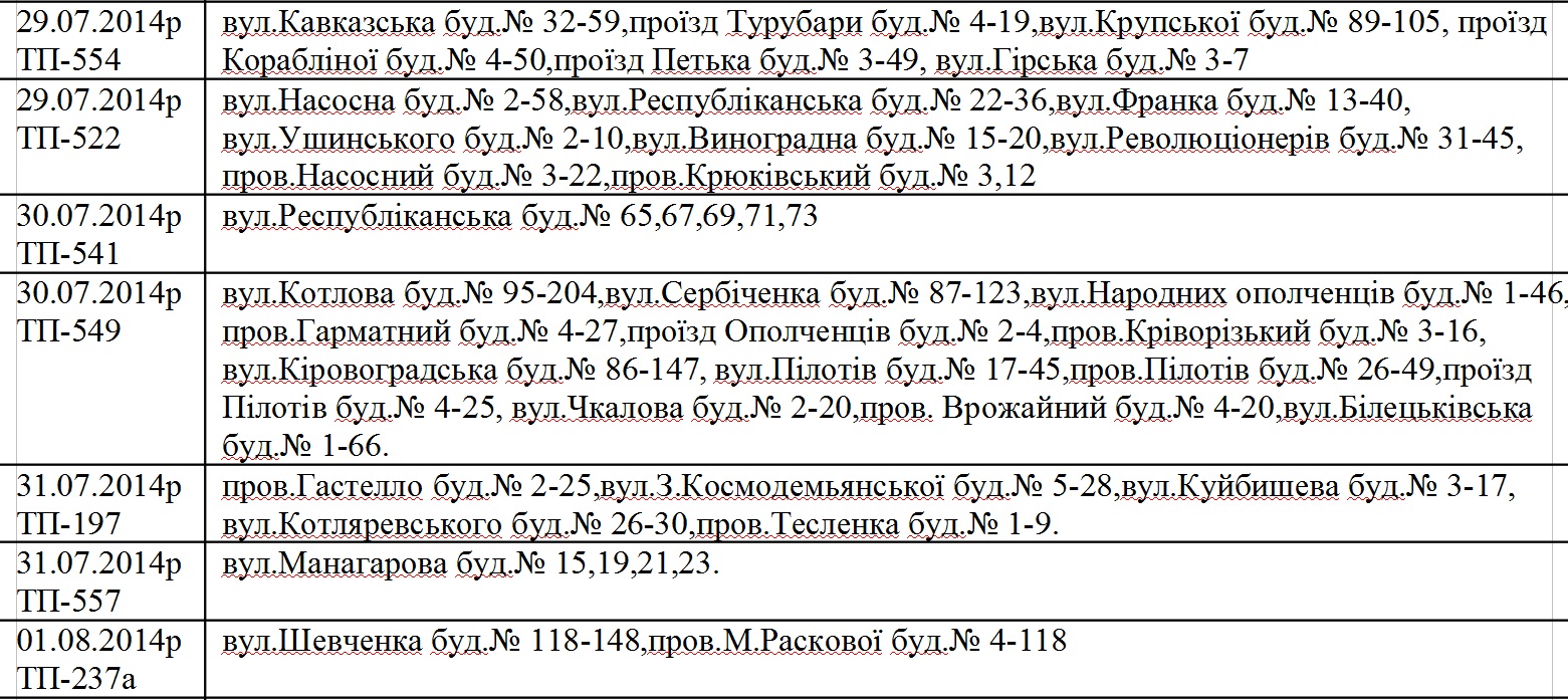 В Кременчуге в связи с ремонтом электросетей с 29 июля до 1 августа включительно возможны отключения с 6.00 до 18.00 по таким адресам: