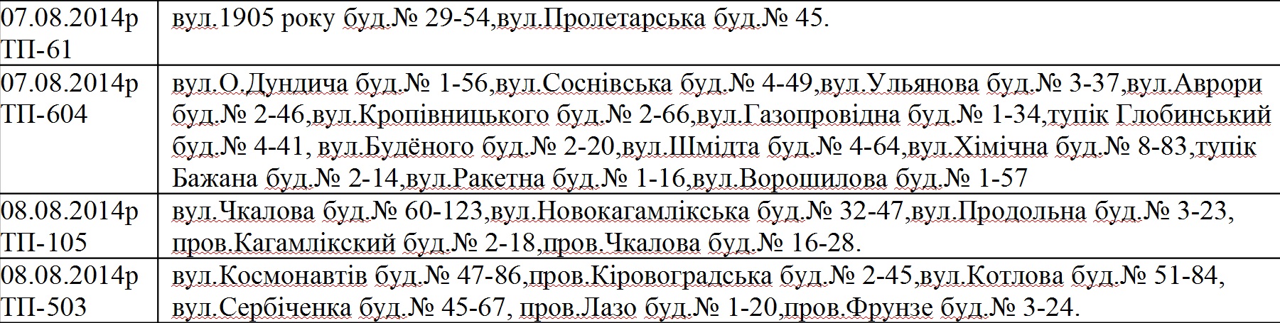 В Кременчуге в связи с проведением ремонтных работ на объектах "Полтаваоблэнерго" 7 и 8 августа возможны перебои в электроснабжении с 6.00 до 18.00 по таким адресам: