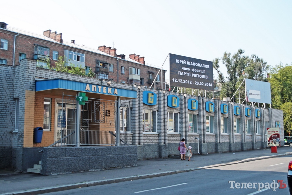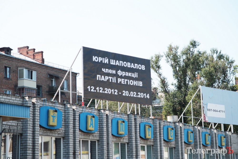 14 августа на рекламном щите на здании центральной коммунальной аптеки по ул. Октябрьская появился черный баннер с белой надписью «Юрій Шаповалов. Член Фракції регіонів. 12.12.2012-20.02.2014».