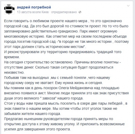 "На сегодня строительство остановлено. Причины вполне понятны - отсутствие денег. Сколько такая ситуация будет продолжаться - неизвестно. Побывав там на выходных, мы с семьей поняли, чего нашему городскому озеру не хватает. Ему нужна жизнь и сегодня... Стоя у воды мы решили поселить в озере две пары лебедей в знак памяти о нашем мэре. Мы хотим, чтобы этот уголок также не забывали жители нашего города. Предлагаю нынешним руководителям города принять меры по открытию доступа к этому живому уголку. И приложить всевозможные усилия для завершения этого проекта", - написал А.Погребной.