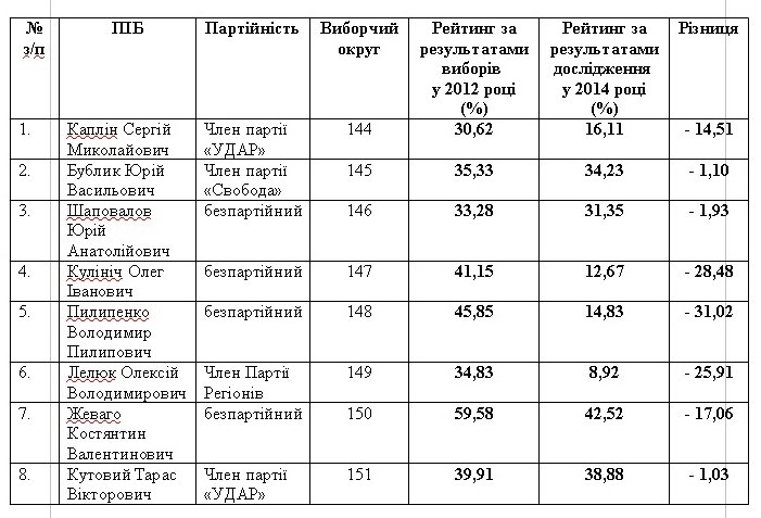 В таблице 1 приведены результаты сравнения: как на сегодняшний день изменились рейтинги народных депутатов с момента выборов в Верховную Раду Украины в 2012 году.