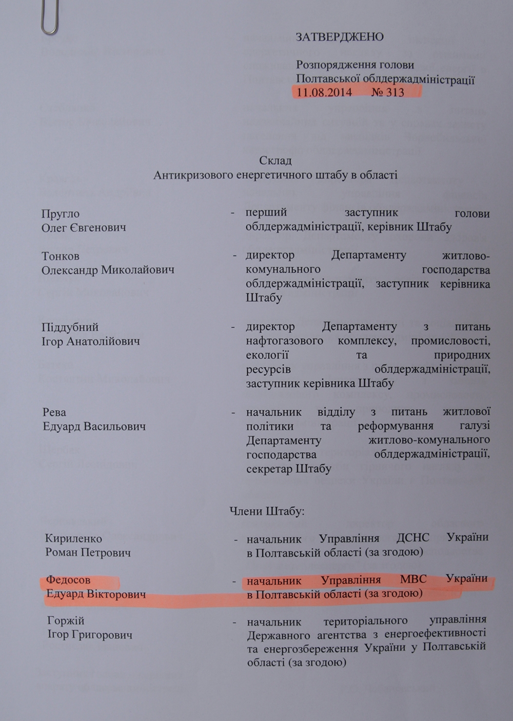 В состав штаба вошли 18 человек, включительно с главным милиционером области - Эдуардом Федосовым, который был уволен еще 27 февраля этого года.