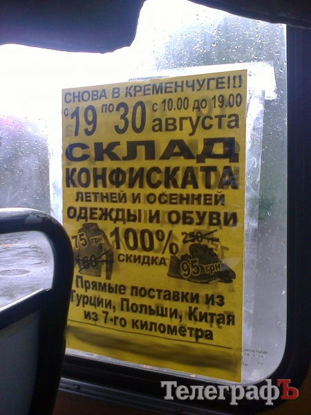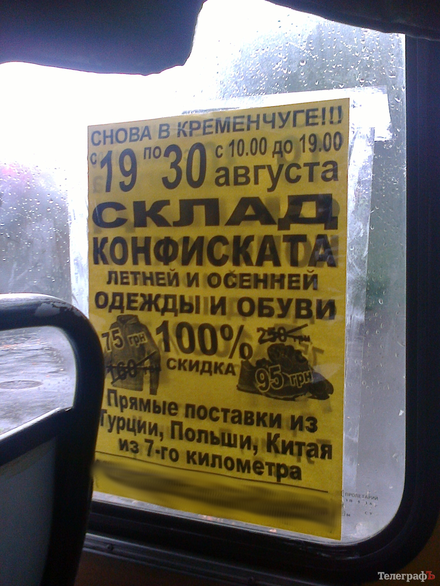 Опомнитесь, о люди! Грядёт Математический Ад! Всадники образовательного апокалипсиса промчались по Кременчугу и расставили сети для заблудших меж гранитных камней познания граждан. Как сообщают в пресс-службе Свидетелей Большого Экзамена, на домах и в общественном транспорте в Кременчуге появились объявления, которые призывают людей на распродажу конфиската со 100%-й скидкой. Любой человек, дружащий с математикой, понимает, что одежду и обувь будут раздавать даром. Но не тут-то было – на объявлении указаны примеры «расчёта» 100%-й скидки! Так, если раньше вещь стоила 250 гривен, то сейчас – 95, была 160 – стала 75 грн! То есть, авторы объявления считают, что 100 = 38 = 46,9. Возможно, это новое слово в математике.