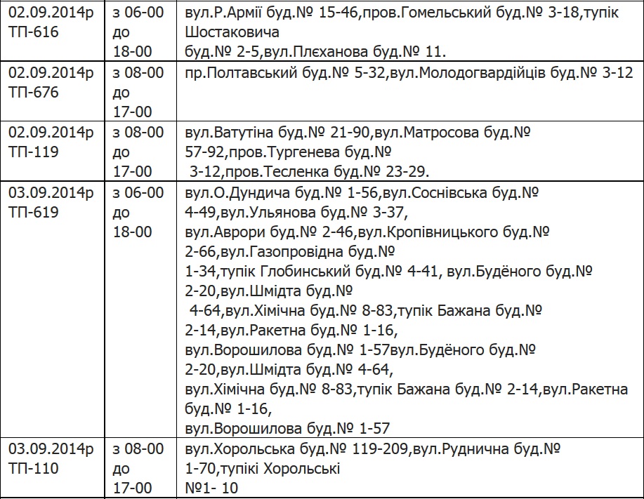 В Кременчуге в связи с ремонтными работами "Полтаваоблэнерго" 2 и 3 сентября возможны отключения электроэнергии по таким адресам: