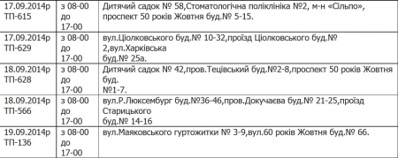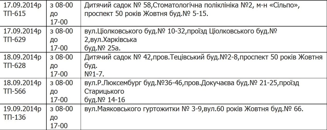 В связи с ремонтными работами "Полтаваоблэнерго" 17, 18 и 19 сентября 2014 г. возможны перебои в электроснабжении по таким адресам: