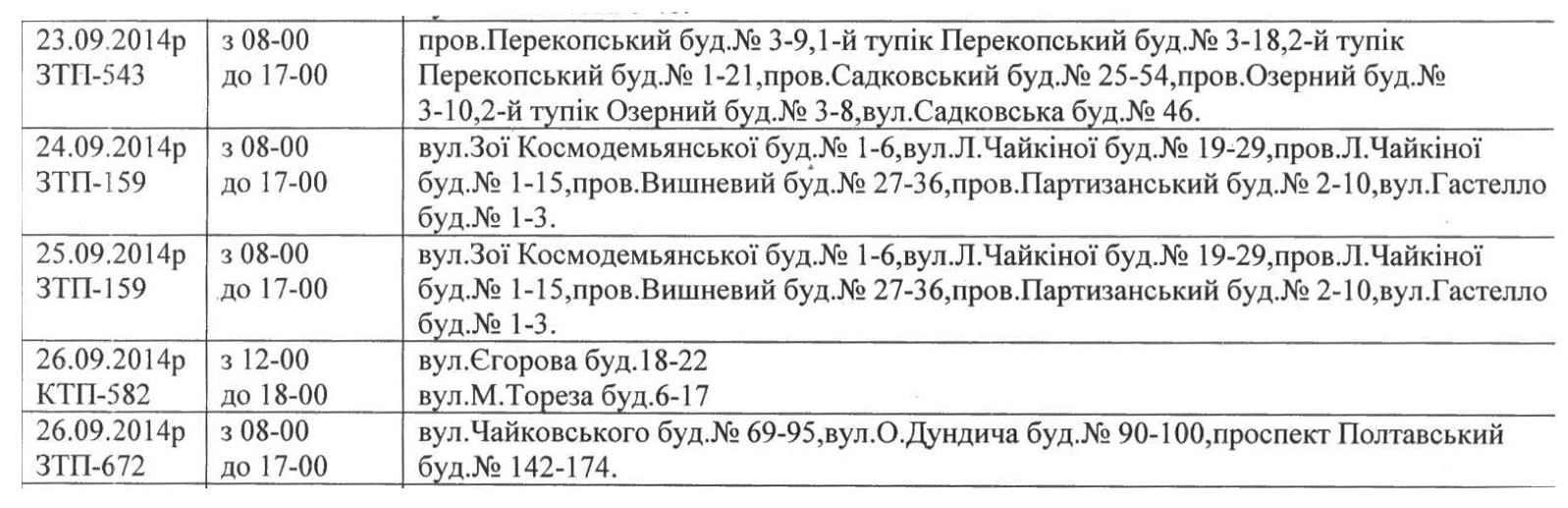 В Кременчуге с 23 по 26 сентября 2014 г., в связи с проведением текущих и капитальных ремонтов трансформаторных подстанций и воздушных линий электропередач возможны перебои в электроснабжении по таким адресам: