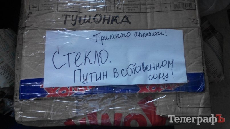 А также ящик тушёнки с веселой надписью «Путин в собственном соку. Приятного аппетита!»
