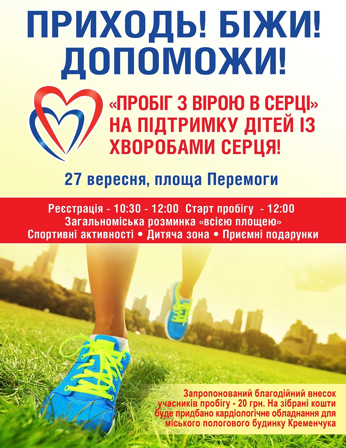 – Для участия в пробеге необходимо внести 20 грн благотворительного взноса. В ответ вы пролучите номер участника пробега, футболку и талон для розыгрыша призов, который состоится после окончания пробега. Перед пробегом будет разминка, которую проведет олимпийский чемпион Владимир Киселев и известная спортсменка Татьяна Рогозина. Также до пробега и после со сцены участников будут развлекать коллективы Дома детского творчества и ОДЮК, – сказал вице-мэр Малецкий.