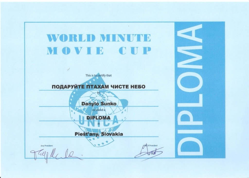 Кроме этого, студию наградили дипломом 76-го Международного фестиваля любительского кино «Уника», который проходил в Словакии, за одноминутный мультфильм «Подарите птицам чистое небо».