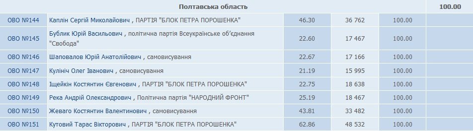 Из 8 округов Полтавщины на 5-ти победила партия «Народный фронт». Лидер – Арсений Яценюк. На 3-х – «Блок Петра Порошенко», первым номером в котором идет мэр Киева Виталий Кличко.