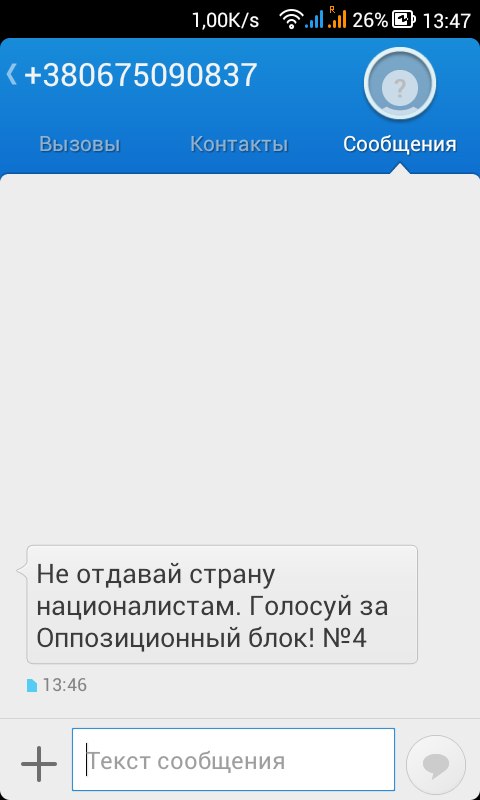 Смс были следующего содержания: «Не отдавай страну националистам. Голосуй за «Оппозиционный блок».