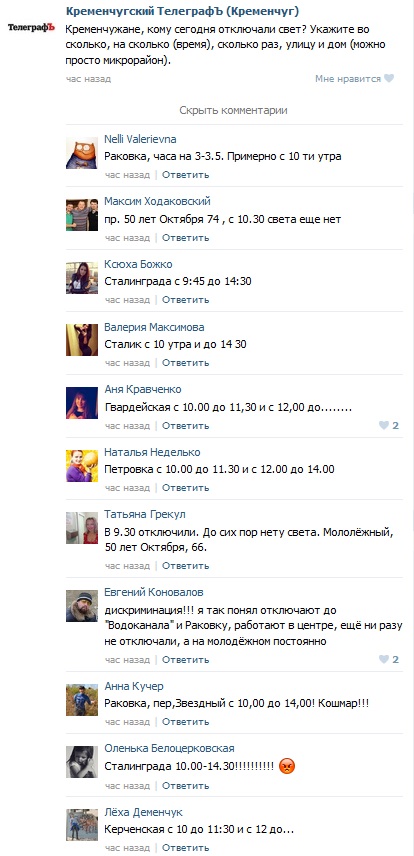 Кременчужане жалуются, что одни дома выключают по несколько раз в день, а некоторые вообще ни разу не выключали. Часто выключают дома, которых вообще нет в очередях