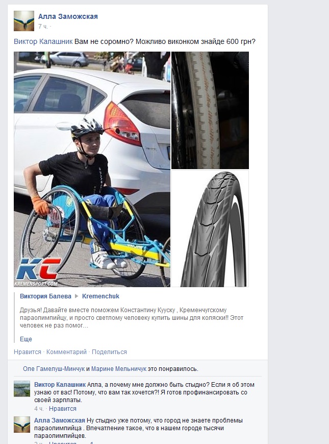 Первый вице-мэр Кременчуга Виктор Калашник готов профинансировать покупку шин для инвалидной коляски параолимпийцу Константину Кууску. Об этом свидетельствует переписка В.Калашника и пользователя Аллы Заможской в соцсетях.