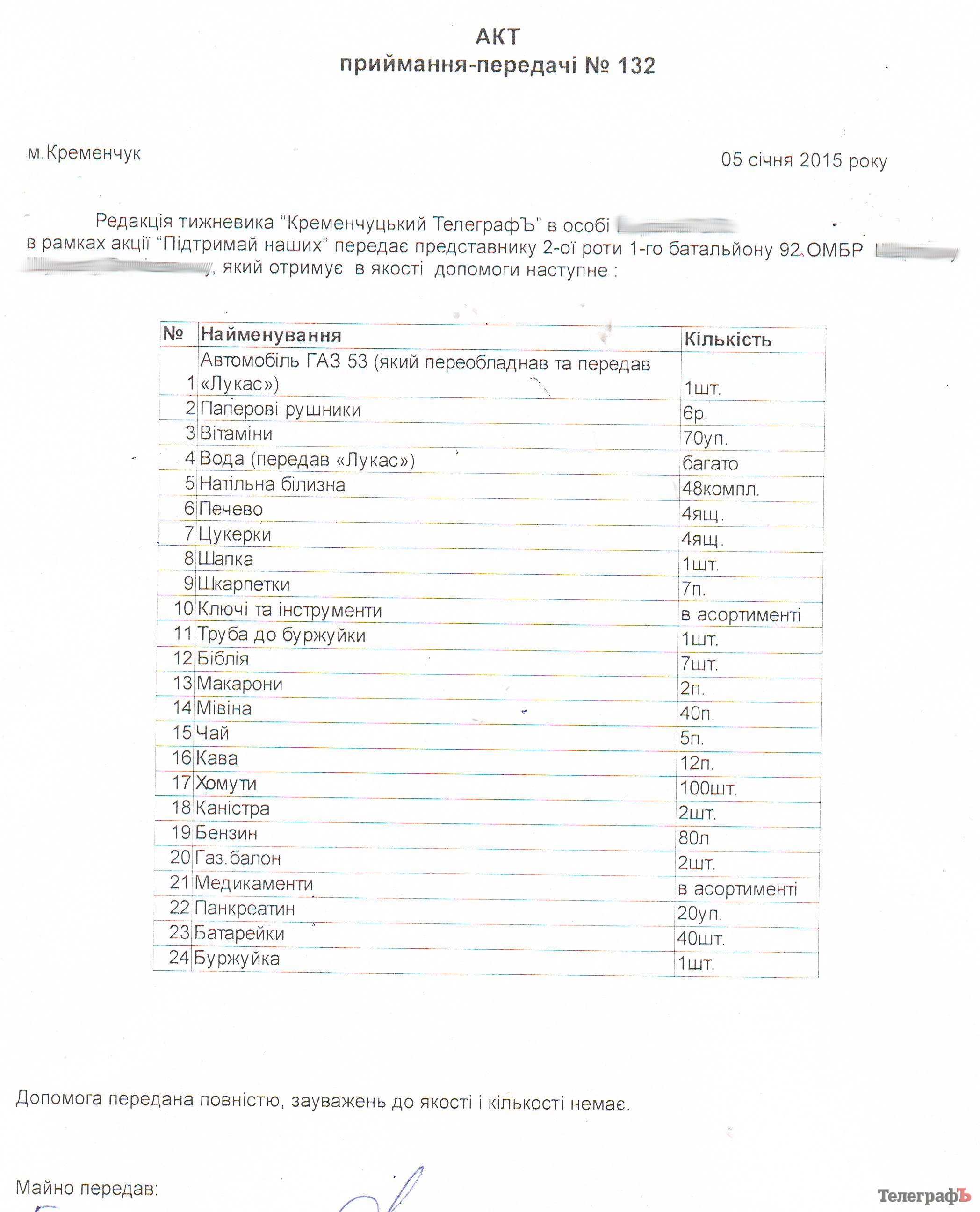 Машину военным передали на территории ИД «Приватна газета». С собой солдатам передали две канистры, принесенные кременчужанами, наполнив их 80 литрами бензина на деньги, принесёнными гражданами. Передали 48 комплектов нательного белья, витамины и медикаменты, продукты и др. «Лукас» загрузил машину водой. Также предприятие передало раненным военным, которые находятся в госпитале ветеранов ВОв, 10 ящиков печенья.