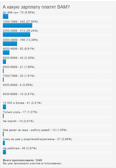 По результатам опроса на сайте «Телеграф», большинство кременчужан получает до 2000 гривен. Чуть меньше получает от 2000 до 3000 гривен.